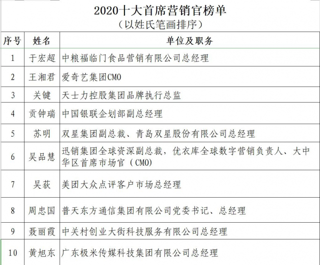 在这个汇聚多方精英的中国广告主盛典上,作为大会的重磅“大戏”,备受瞩目的“2020十大首席营销官榜单”揭开神秘面纱,首度亮相。